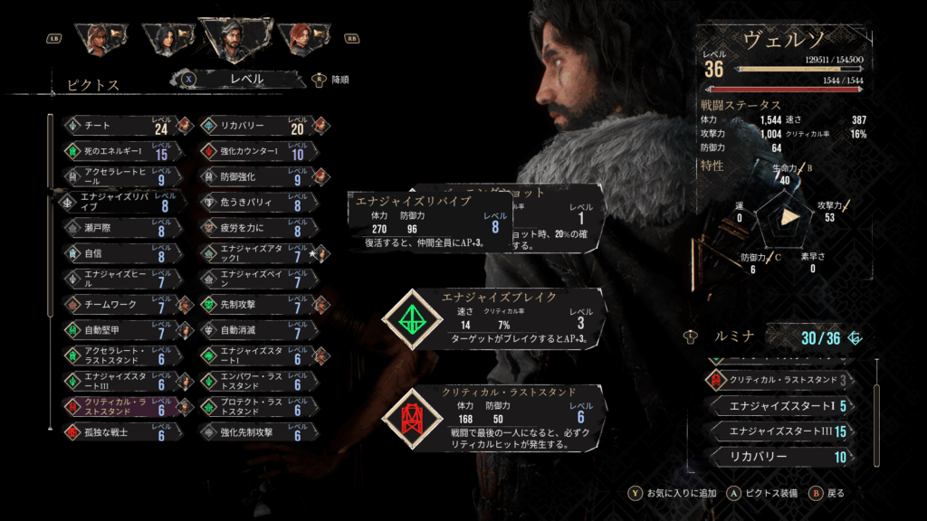 基本的にはパーティで戦うゲームですし、「リカバリー(ピクトス)」とルネがいれば壊滅しづらいので、常時全体火力アップは非常にやばいです。