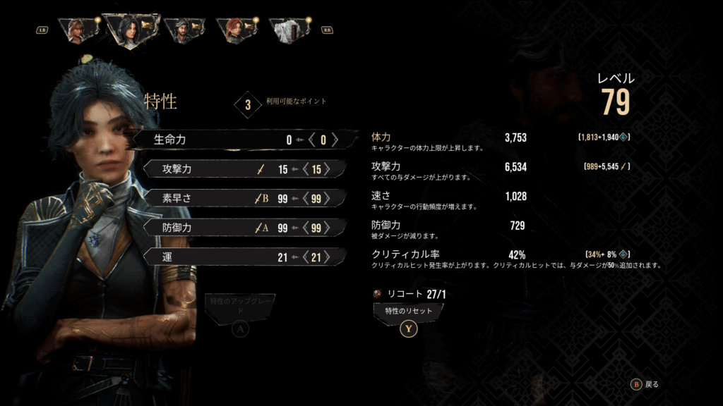 ステータス: 武器に大きく依存しますが、運(クリティカル率のため最重要)、素早さ(行動回数)は高めにしたいです。武器によっては攻撃力