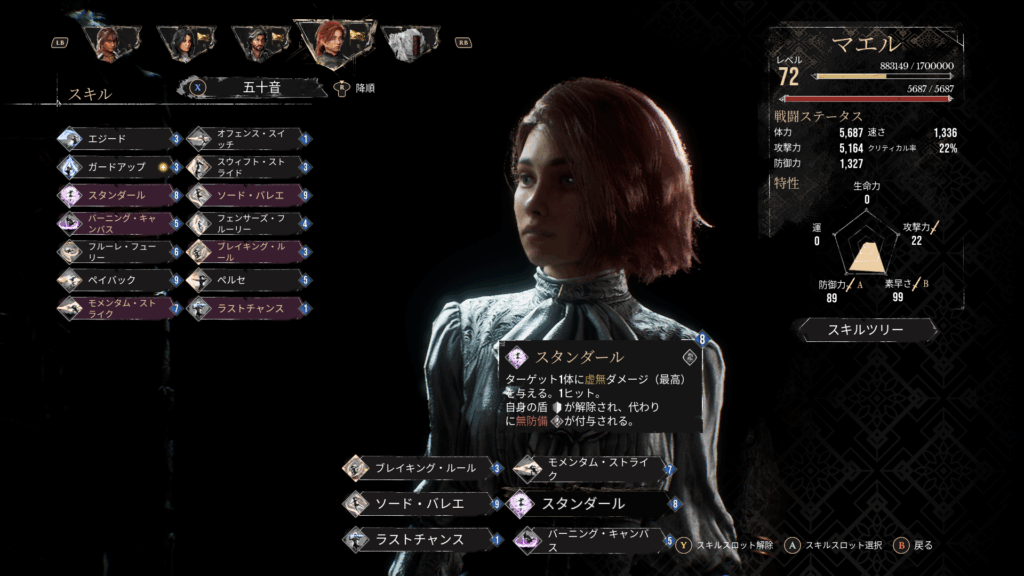 「ラストチャンス」「スタンダール」「ブレイキング・ルール」「モメンタム・ストライク」or「バーニング・キャンバス」の4つはほぼ固定でも良いのかなと思うくらいに安定のスキルです。