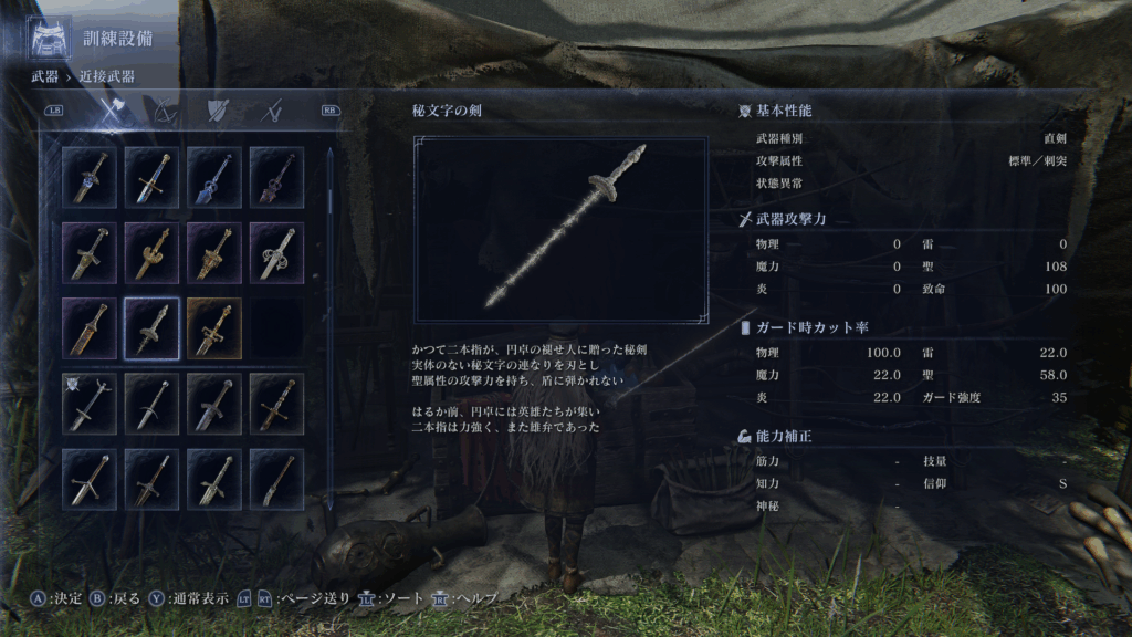| 秘文字の剣 | 信仰(S) | 純聖属性ダメージ | FP枯渇時のメイン武器 |