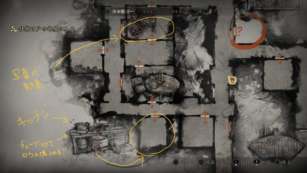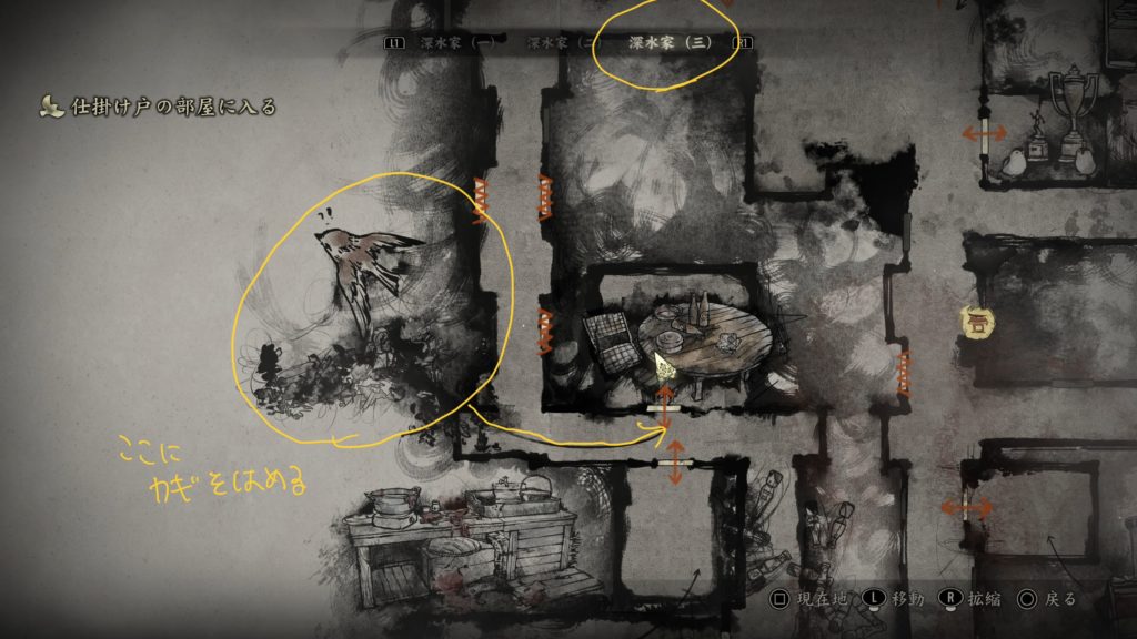 絵の額縁の部屋のすぐそばに、キッチンの部屋がありますので(マップは深水家1)
